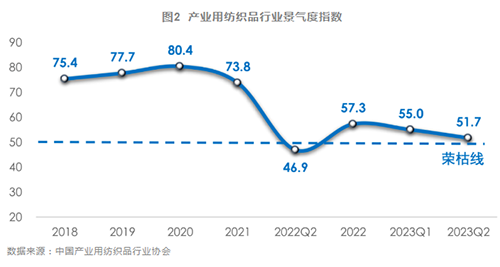 根據協會對樣本企業的調研,2023年上半年產業用紡織品行業的景氣指數為51.7,處于微景氣區間,較2023年一季度下降3.3,較2022年同期上升4.8,遠低于2021年前的指標(圖2)。