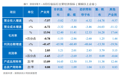 根據國家統計局數據,2023年1~6月產業用紡織品行業規模以上企業的營業收入與利潤總額分別同比下降7.6%和41.5%,利潤率2.9%,同比下降1.7個百分點。