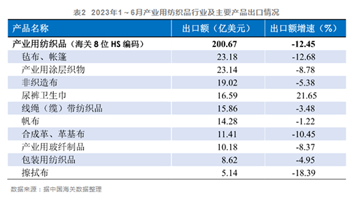 根據中國海關數據,2023年1~6月我國產業用紡織品行業的出口額(海關8位HS編碼統計數據)為200.7億美元,同比下降12.5%,降幅有所加深;1-6月行業進口額(海關8位HS編碼統計數據)為26億美元,同比下降17.3%。