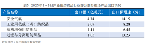 盡管整體出口下降,但一些較高技術含量的細分市場產品的出口則保持了較高的增速,如安全氣囊出口4.3億美元,同比增長14.2%;工業用氈毯出口2.1億美元,同比增長8.3%;結構增強用紡織品出口1.1億美元,同比增長6.5%;過濾與分離用紡織品出口1.1億美元,同比增長13.2%(表3)。這些反映了近年來行業在技術創新、產品開發和市場拓展方面取得了積極成效。