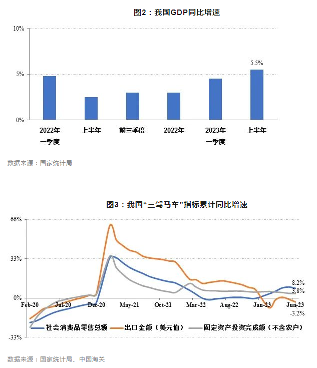隨著經濟社會全面恢復常態化運行,今年以來我國宏觀經濟總體呈現恢復向好態勢,工業生產及內銷形勢均實現較好回升。統計數據顯示,上半年我國GDP同比增長5.5%,增速較上年同期和今年一季度分別回升3和1個百分點,經濟增速居于全球前列;同期,規模以上企業工業增加值、社會消費品零售總額同比分別增長3.8%、8.2%,增速較上年同期分別回升0.4和8.9個百分點,較一季度分別回升0.8和2.4個百分點。但二季度以來,受外需疲弱、內生動力不足影響,我國出口形勢承壓,企業利潤修復緩慢、市場預期不穩等問題較為突出,經濟持續向好基礎仍待鞏固。上半年,全國商品出口總額(美元計價)同比減少3.2%,增速較上年同期和今年一季度分別下滑17.1和1.7個百分點;規模以上企業利潤總額同比減少16.8%,降幅較今年一季度收窄4.6個百分點;固定資產投資完成額(不含農戶)同比僅增長3.8%,增速較上年同期和今年一季度分別回落2.3和1.3個百分點。7月我國制造業PMI為49.3%,仍位于收縮區間,其中新出口訂單指數為46.3%,連續第5個月環比下降。