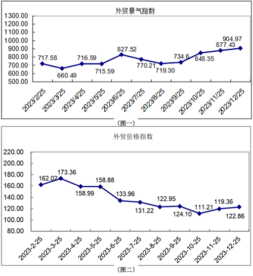 如圖1、圖2所示,2023年12月份外貿景氣指數收于904.97點,環比上漲3.14%;外貿價格指數收于122.86點,環比上漲2.93%;外貿信心指數收于1222.23點,環比上漲15.14%。