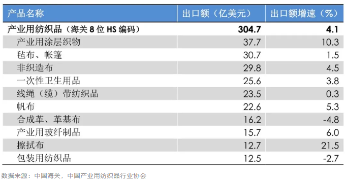 表2 2024年1-9月產業用紡織品行業及主要產品出口情況
