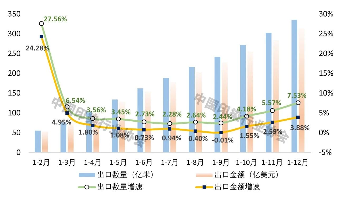 根據中國海關統計數據,2024年1~12月,我國印染八大類產品出口數量335.34億米,同比增長7.53%,增速較前三季度提高5.09個百分點;出口金額312.95億美元,同比增長3.88%,增速較前三季度提高3.89個百分點;出口平均單價0.93美元/米,同比降低3.39%,降幅較前三季度擴大1.00個百分點。四季度,隨著國外感恩節、圣誕節等重要節假日的到來,海外紡織服裝補庫存需求逐步釋放,國際市場對我國印染面料需求增加,同時受美國政府對中國出口產品潛在加征關稅的影響,我國紡織服裝企業積極調整外貿節奏,短期內“搶出口”效應進一步推高印染產品出口增速。