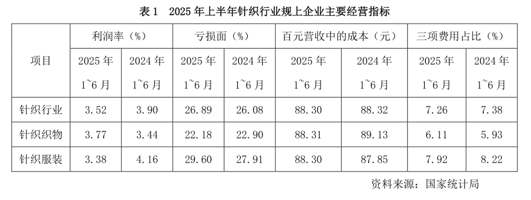 上半年針織行業規模以上企業利潤總額同比下降11%;利潤率為3.52%,較上年同期下降了 0.37個百分點。針織兩大行業在效益表現上出現分化,針織織物的效益保持同比增長,針織服裝受終端市場內卷加劇、出口關稅等多重因素影響,效益同比明顯下降。