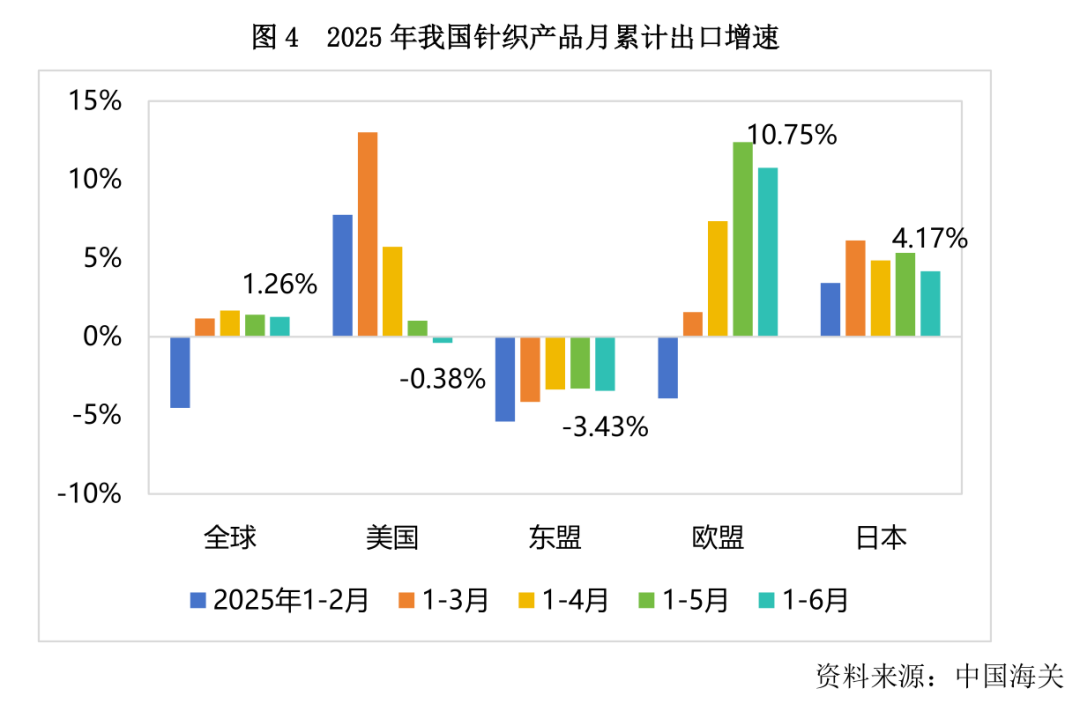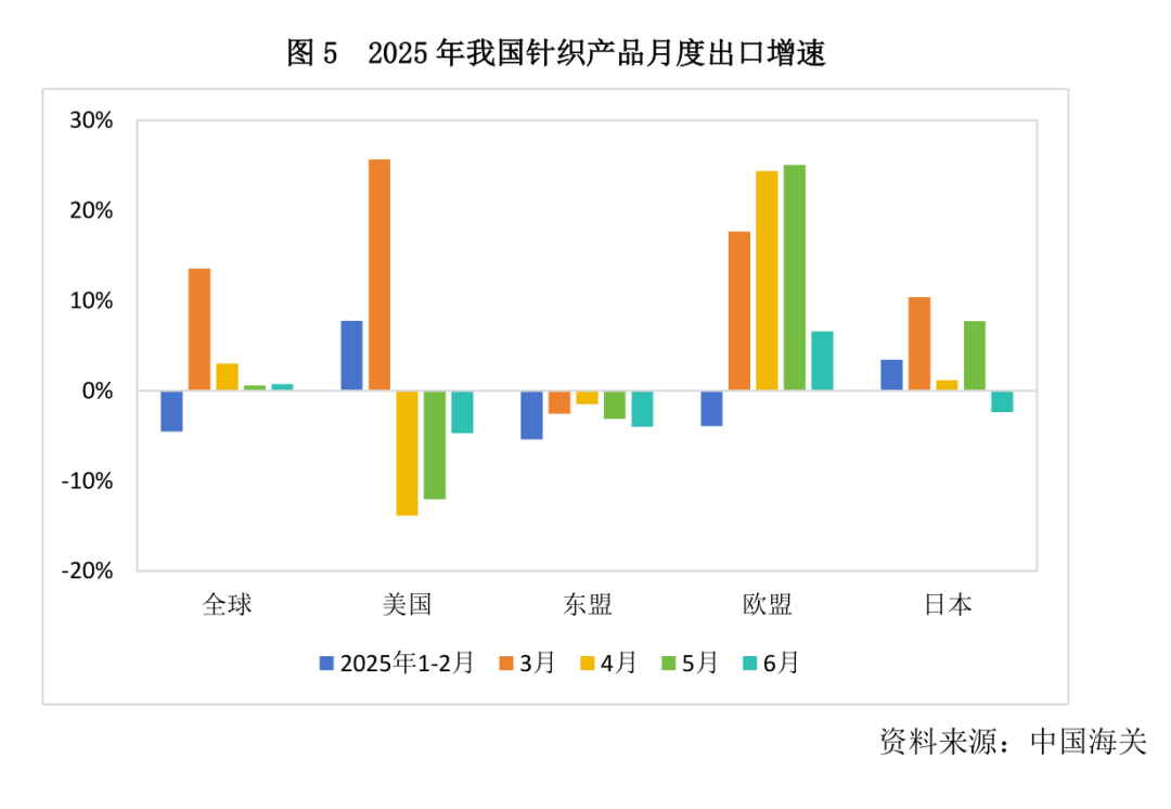 從主要出口市場來看,1~6月我國針織產品對美國出口88.92億美元,同比下降0.38%,增速同比由正轉負。從月度出口看,對美出口受關稅政策影響呈現巨幅波動特征,1~3月新關稅政策生效前企業搶出口,出現大幅增長,1~2月增長7.76%,3月增長25.65%,4月份145%關稅生效,出口大幅下降13.86%,5月12日暫停實施關稅90天,積壓訂單加速出貨,5月出口降幅收窄至12.03%,6月進一步收窄至4.73%。