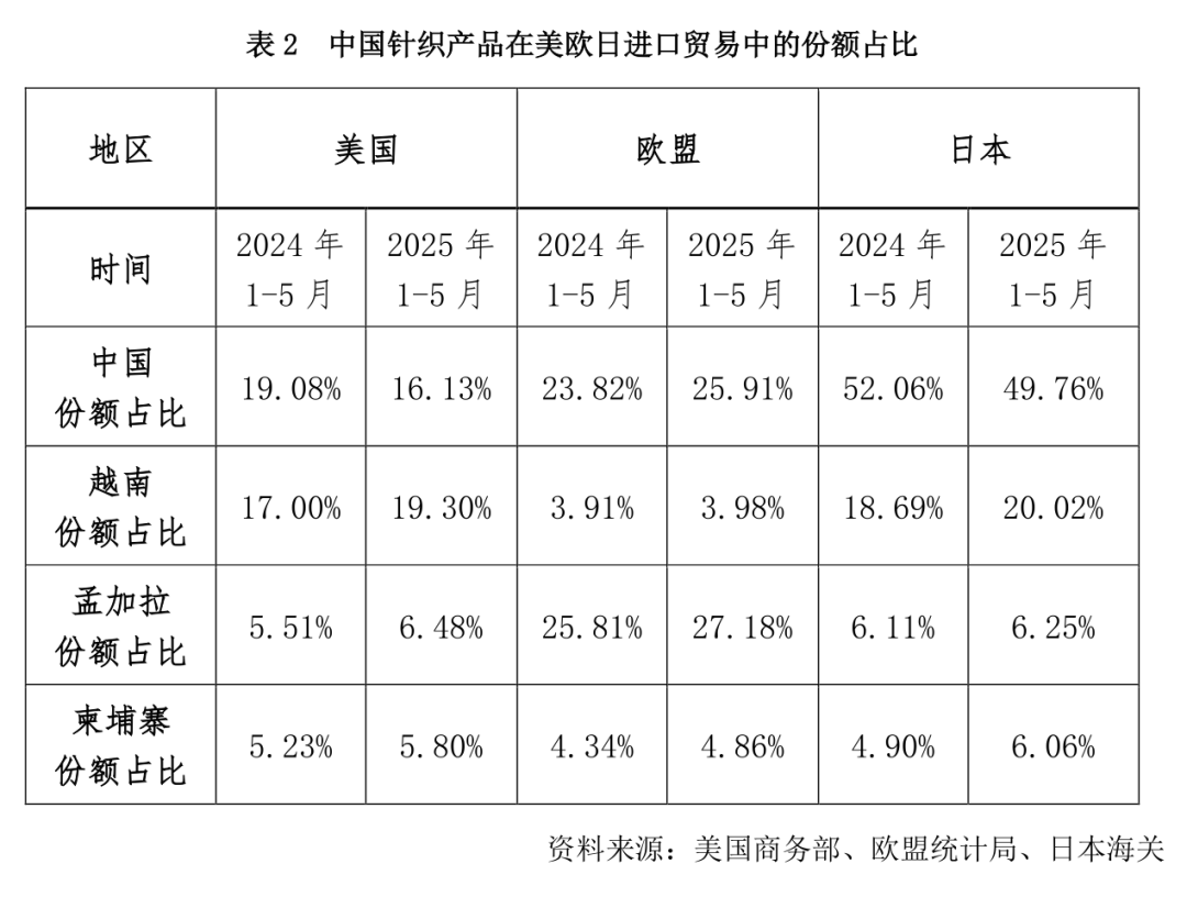 據美國商務部數據顯示,1~5月美國進口針織產品同比增長6.69%,其中自中國進口同比下降9.84%,當前中國占美國的市場份額為16.13%,占比較上年同期回落2.96個百分點。同期孟加拉國的占比提高近1個百分點,越南的占比則提高了2.31個百分點,越南占美國的市場份額于今年首次超越中國,達到了19.30%。