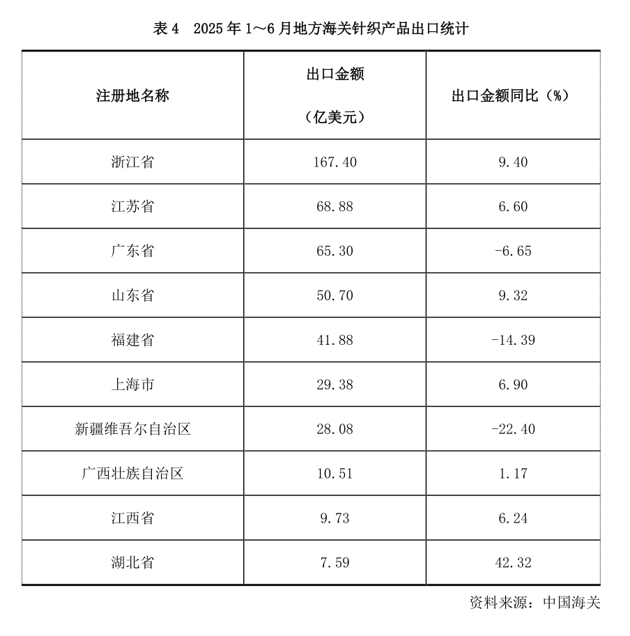 從地方海關數據來看,1~6月位列針織產品出口前五位的地區中,浙江、江蘇、山東情況較好,出口額同比分別增長9.4%、6.6%和9.32%。廣東和福建同比分別下降6.65%和14.39%。受去年同期高基數影響,新疆出口同比下降22.4%,得益于近幾年政府對行業的政策支持,湖北出口同比增長42.32%。