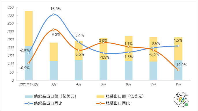 2025年1~8月全國紡織品、服裝出口月度統計