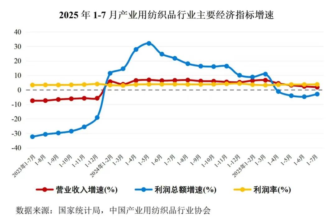 經濟效益方面,根據國家統計局數據,1-7月產業用紡織品行業規模以上企業的營業收入同比增長1.9%,利潤總額同比下降2.9%;營業利潤率為3.8%,同比下降0.2個百分點。行業企業利潤仍處于下降區間,但降幅有所收窄。