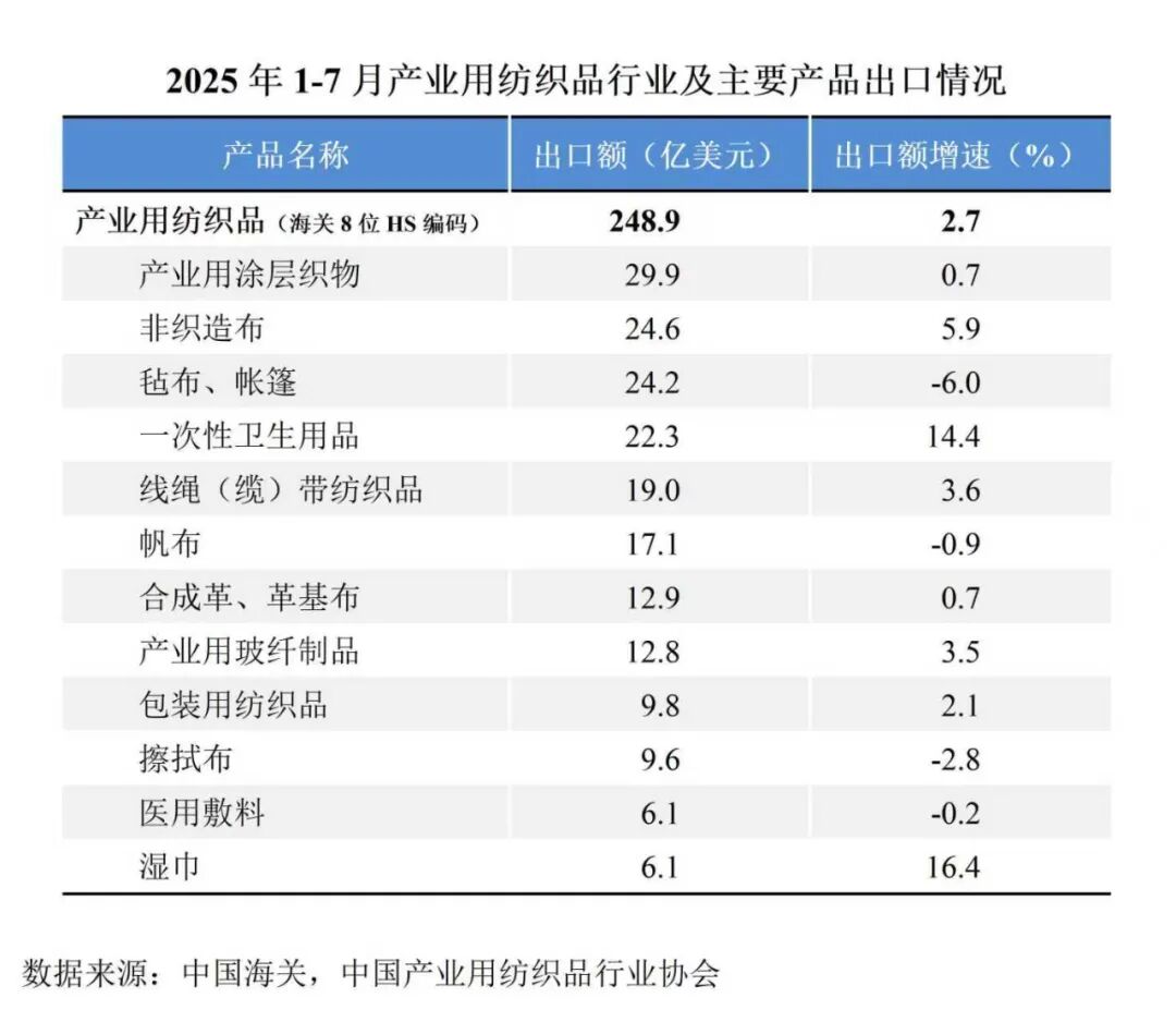 國際貿易方面,根據中國海關數據(海關8位HS編碼統計數據),2025年1-7月我國產業用紡織品行業的出口額為248.9億美元,同比增長2.7%;行業進口額為31.4億美元,同比增長3.8%。