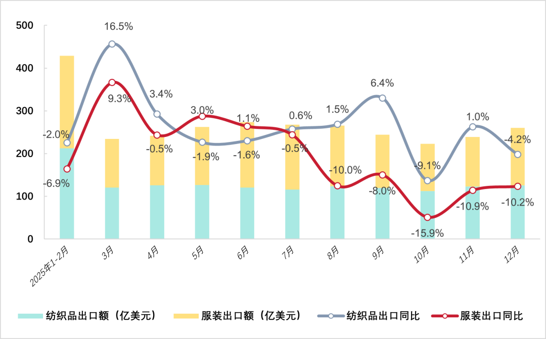 圖1 2025年全國紡織品、服裝出口月度統(tǒng)計