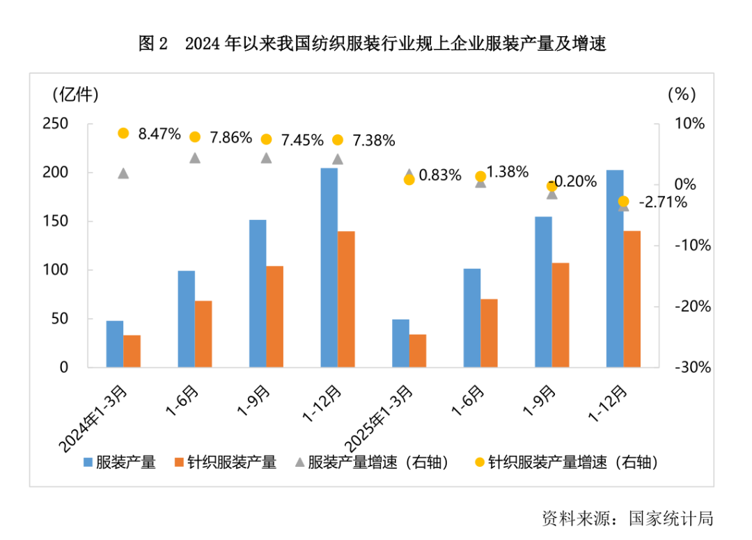 針織服裝份額持續鞏固。2025年,我國紡織服裝行業規模以上企業服裝產量202.55億件,同比下降3.44%;其中針織服裝產量140.25億件,同比下降2.71%,降幅低于服裝總產量整體水平,顯示出針織服裝的市場需求相對穩健。2025年針織服裝產量占服裝總產量的比重達69.24%,較2024年的68.35%略有提升,產業結構優勢持續鞏固。