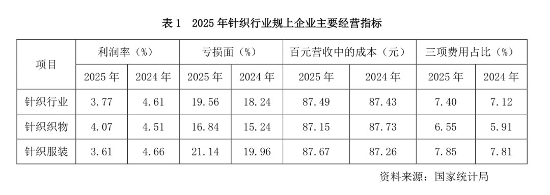 利潤率連續下降。2025年,針織行業營業利潤率3.77%,較2024年同期的4.61%下降0.84個百分點。其中,針織織物營業利潤率4.07%,較2024年的4.51%下降0.44個百分點;針織服裝營業利潤率3.61%,較2024年的4.66%下降1.05個百分點。