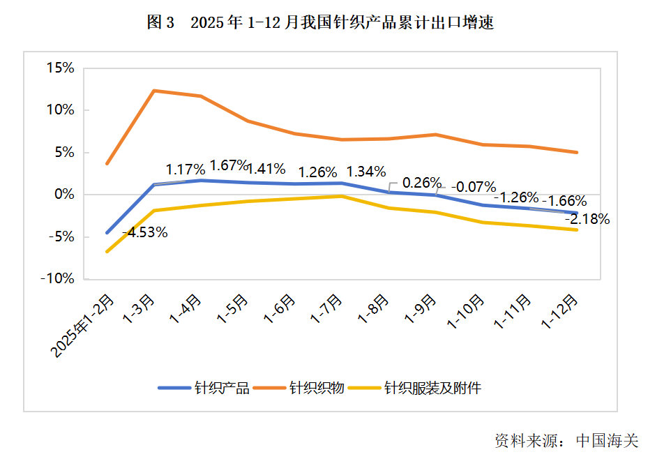 據中國海關數據統計,盡管受美國關稅政策沖擊等多種不利因素影響,但2025年我國針織產品出口1066.56億美元,同比下降2.18%,在高基數背景下出現小幅下滑,連續5年超千億美元。分品類來看,針織織物出口249.55億美元,同比增長4.99%,保持穩健增長;針織服裝及附件出口817億美元,同比下降4.18%,成為拉低整體出口增速的主要因素。從月度累計增速走勢看,2025年前8個月針織產品出口增速總體為正,自9月轉為負增長,反映出國際市場需求的持續走弱和關稅對全球供應鏈重構的深度影響。