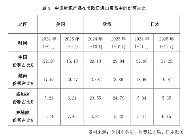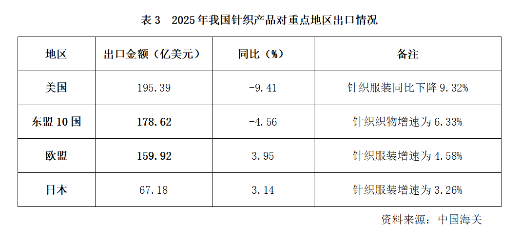 出口市場格局深度調整。2025年,受關稅政策影響,對美國出口195.39億美元,同比下降9.41%,我國產品在美市場份額面臨結構性擠壓,據美國商務部數據,2025年1~9月,我國針織產品在美進口市場份額從2024年的22.13%急劇下滑至15.18%,越南市場份額則提升至20.47%,首次超越中國,訂單向越南、柬埔寨等東南亞國家轉移趨勢明顯。對歐盟出口159.92億美元,逆勢增長3.95%,據歐盟統計局數據,2025年1~10月,我國針織產品在歐盟進口貿易中占比由2024年的29.32回升至29.87%,領先第二名孟加拉5.08個百分點,顯示出行業的出口韌性。對日本出口67.18億美元,實現3.14%的增長。據日本海關數據,2025年1~11月,我國針織產品在日本進口貿易中占比由2024年52.81%小幅回落至51.25%,仍呈下降趨勢。對東盟10國出口178.62億美元,同比下降4.56%,而針織織物出口則同比增長6.33%,反映出美國關稅政策對成品轉口貿易的影響和我國針織織物在東盟市場的競爭優勢。