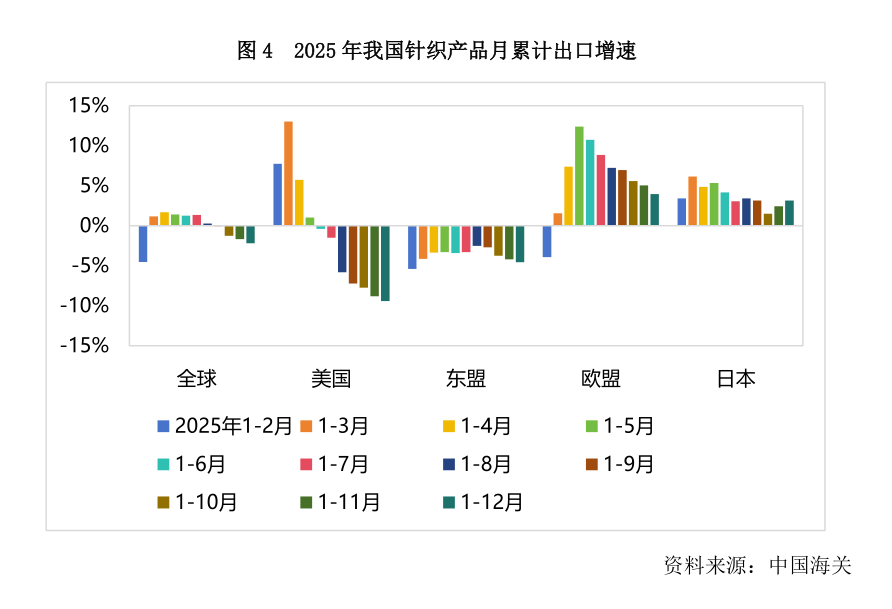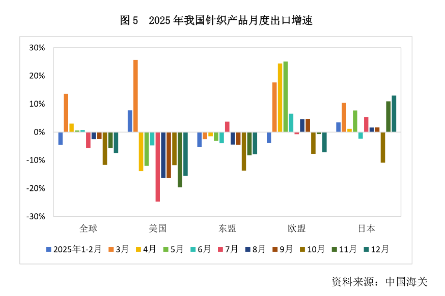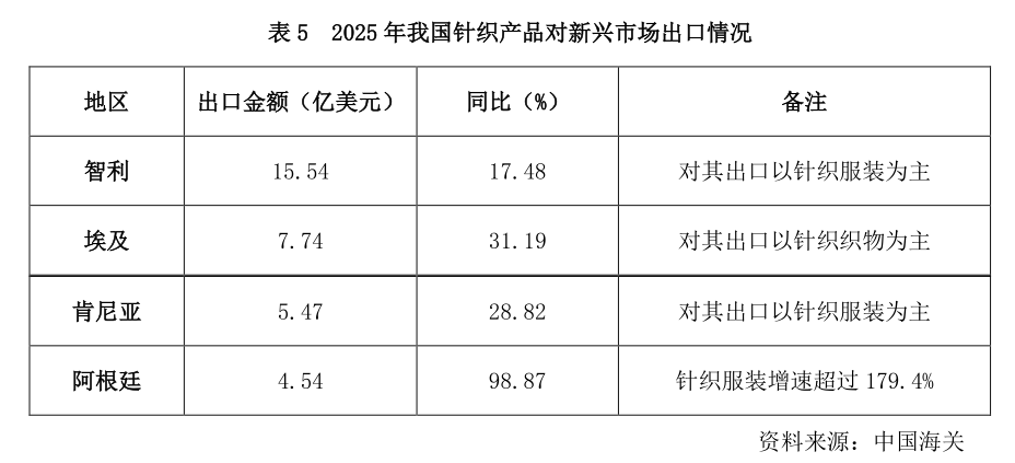 2025年,我國對智利出口15.54億美元,同比增長17.48%,出口以針織服裝為主;對埃及出口7.74億美元,同比增長31.19%,以針織織物為主;對肯尼亞出口5.47億美元,同比增長28.82%,針織服裝占比居前;阿根廷出口4.54億美元,同比激增98.87%,其中針織服裝增速超過179.4%,展現出新興市場的巨大潛力。盡管當前基數較小,但已成為驅動出口增長、分散市場風險的重要新興力量。