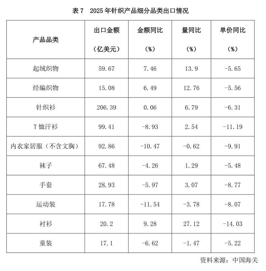 出口品類量增價跌,出口結構向價值鏈上游攀升。2025年,起絨織物、經編織物、針織襯衫出口表現良好,出口增速分別為7.46%、6.49%、9.28%,其中,針織襯衫出口額占襯衫出口額的33.25%,同比提升4.42個百分點。T恤汗衫、內衣家居服、運動裝受去年同期高基數影響,出口分別下降8.93%、10.47%、11.54%。針織織物出口保持連續增長態勢,在針織產品出口中的占比持續提高,科技進步推動出口結構向價值鏈上游攀升。另一方面,主要品類普遍出現量增價跌,反映出在勞動力成本優勢減弱背景下,低附加值產品面臨的國際競爭尤為激烈,企業需要通過科技創新,加大高端化、功能化、綠色化等高附加值、差異化產品的開發,從依靠低成本規模優勢的OEM模式,向依托技術、設計和快速反應能力的ODM模式和品牌化轉型。