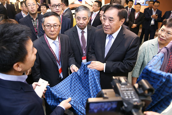 在江蘇陽光的展位上,董事長陳麗芬逐一介紹公司的產品,從“陽光藍”面料到“閱兵服”面料,從針織毛紡面料到雙面呢面料,所有產品都贏得參觀者的青睞。特別是公司推出了新的高端定制品牌SUNDIVO后,今年的銷售同比增長了5倍。陳麗芬說,不要以為紡織不行了,市場還是有的,全球的需求還是有的,關鍵是要及時調整。 在新技術創新空間展區,王天凱更關注新技術的應用情況,他說,新的技術一定要具有推廣價值,讓行業盡快受益。在以“綠色制造”為主題的社會責任展區,20家海外高端品牌組成的“ZDHC有害化學物質零排放締約品牌組織”代表與中國供應商有了面對面交流的機會,共同致力于紡織業可持續發展的推進。王天凱一行高興地在“綠色制造”大背景展板前簽名點贊。