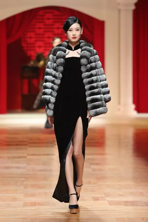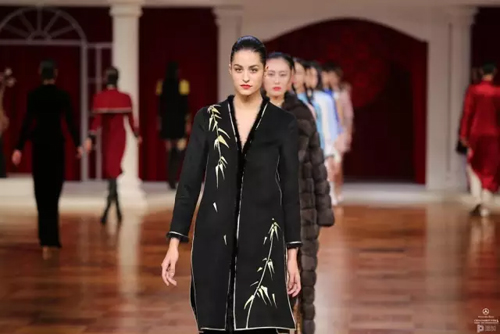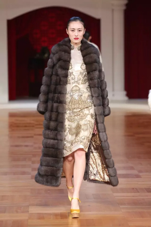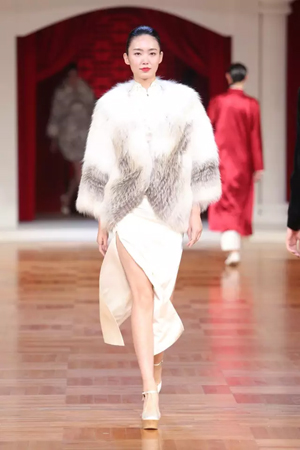 北洋軍閥時期的華麗軍裝形制簡便,精致洋裝充滿活力,清末貴族裘皮服飾再度重現傳統風姿,一場服飾變革席卷而來。細節方面絲毫不馬虎,中國傳統蘇繡、勾邊刺繡、米珠刺繡等技藝運用于絲絨、真絲重緞、毛呢等面料之上。 第二幕,五四運動,民族覺醒。