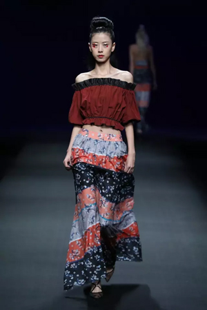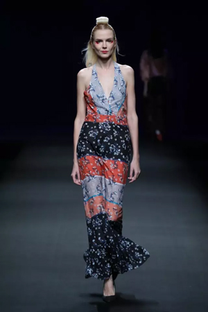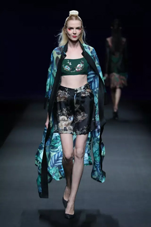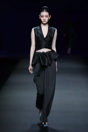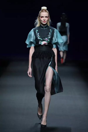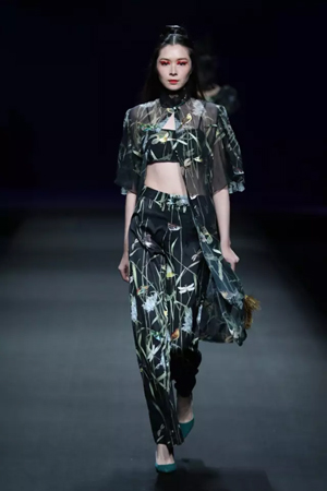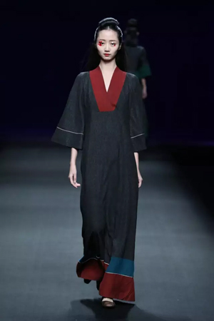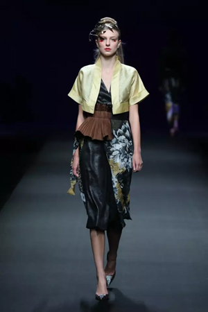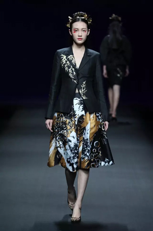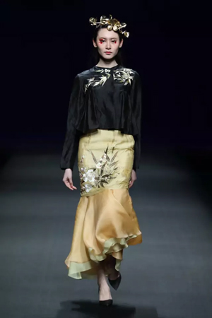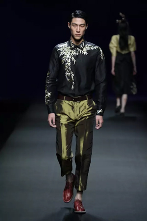 黑色與金色面料,一些漢服元素,時尚的流行色點綴,讓“國家級非物質文化遺產”香云紗綻放在T臺;豹紋褲和波西米亞花裙增添了活力,特別讓人印象深刻的是滿臺精致的苗繡,竹葉和花蝶,配著靛藍、赭石、棗紅、石青的布料,隔多遠都能感受到繡工的樸質精美;更不用說滿場流動的那香云紗的質感:沉沉的分量,只屬于絲綢的閃爍光芒,好品位的代表。金憓給香云紗帶來了時尚感和年輕的活力。