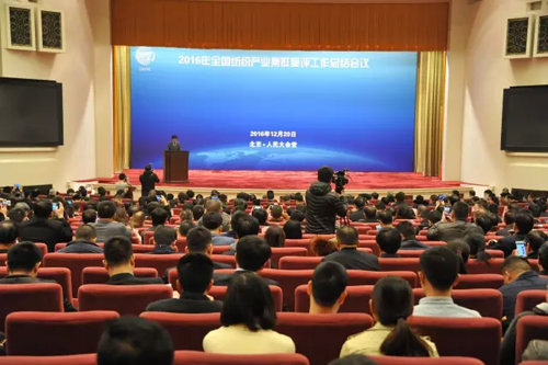 12月20日,2016全國紡織產(chǎn)業(yè)集群復(fù)評(píng)工作總結(jié)會(huì)議在人民大會(huì)堂舉行。中國紡織工業(yè)聯(lián)合會(huì)黨委書記兼秘書長(zhǎng)高勇,會(huì)長(zhǎng)孫瑞哲,原會(huì)長(zhǎng)王天凱、杜鈺洲,原副會(huì)長(zhǎng)許坤元,副會(huì)長(zhǎng)楊紀(jì)朝、夏令敏,黨委副書記陳偉康,紀(jì)委書記王久新,副會(huì)長(zhǎng)徐迎新、陳大鵬、楊兆華、孫淮濱,專家咨詢委員會(huì)委員陳樹津、張延愷、徐文英、張莉,工業(yè)和信息化部消費(fèi)品工業(yè)司副司長(zhǎng)曹學(xué)軍,以及來自全國紡織產(chǎn)業(yè)集群試點(diǎn)地區(qū)的負(fù)責(zé)人和媒體代表等600余人出席大會(huì)。