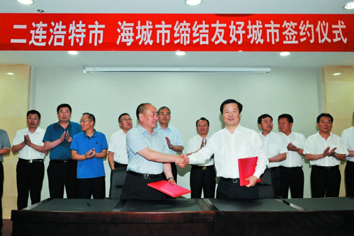 2017.6.4 海城市與二連浩特市締結(jié)為友好城市 海城市西柳市場建設(shè)管理委員會與二連浩特市投資促進局還簽署了合作框架協(xié)議書。相信在雙方市政府的領(lǐng)導下,立足兩地資源優(yōu)勢,雙方將逐步擴大在經(jīng)濟、技術(shù)、資金、旅游、商貿(mào)、人才、教育、文化等領(lǐng)域的合作,定能打通從海城至二連浩特至蒙古國再到俄羅斯以及中東歐各國的貿(mào)易通道。