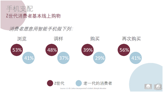 根據歐睿的調查報告,網上服裝消費持續增長,到2018年全球線上服裝銷售達2690億美元。而Z世代絕對是移動的一代,他們基本線上購物。根據美國棉花公司和美國國際棉花協會的全球生活方式調查,中國Z世代消費者愿意使用智能手機做下列:瀏覽(53%),購買(39%),再次購買(56%)。他們也更愿意通過社交媒體獲得著裝理念,更喜歡擁有AI個性化購物體驗的品牌。然而,線下購物對Z世代依然重要。根據美國棉花公司生活方式調查,71%的美國Z世代消費者享受實體店的購物體驗。他們認為線下購買服裝更方便,快捷,享受到品牌提供的客戶服務。