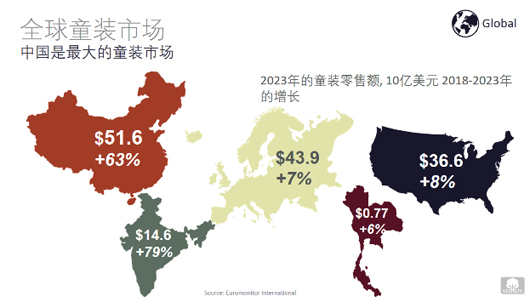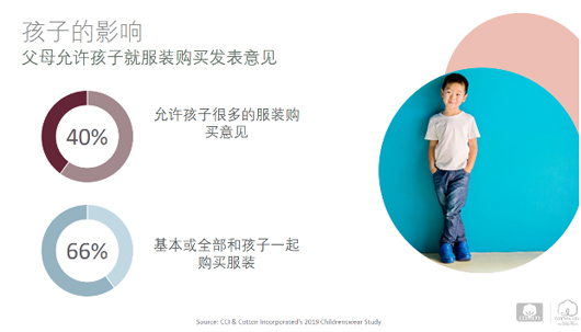 根據歐睿的調查報告,預計從2018年-2023年,中國童裝市場零售額將增至516億美元,比2018年上升63%,是全球最大的童裝市場。在中國,隨著中產階層人口的增加,不斷增長的兒童人均開支,和時尚關注度提高,亞洲童裝市場不斷增長。另一方面,由于可支配收入停滯,出生率降低等原因,西方童裝市場增長緩慢。中國消費者購買童裝時,首要考慮因素是柔軟/舒適,其次是容易穿脫/孩子喜歡,其他因素例如耐穿性價比高也很重要。中國消費者青睞購買全棉或含棉服裝。他們認為棉舒適,柔軟,低過敏性,透氣和高品質。此外,在購買童裝時,孩子對父母也有一定的影響。40%的中國消費者允許孩子給出服裝購買意見。66%的中國父母基本或完全和孩子一起購買服裝。