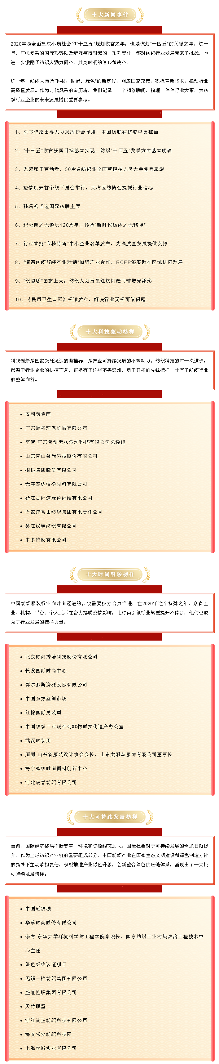 2020年,一場疫情的大考之下,紡織工業在抗擊疫情、復工復產中發揮了重要作用,體現了責任擔當,為人民的健康、為醫療工作者的生命安全提供了重要支撐,也為國際社會抗擊疫情做出了巨大貢獻,更在中國經濟的重啟復蘇中體現出了支柱行業、基礎產業、優勢產業的強勁實力。 在“十三五”收官、“十四五”即將全新開啟之時,在中國經濟步入“國內大循環為主體,國內國際雙循環相互促進”的新發展格局之際,紡織產業需要發揮榜樣的力量,釋放產業發展的潛力和動能,穿越風雨繼續向前! 歲末年初,《紡織服裝周刊》以媒體的視角回望行業發展軌跡,連續第11年發布“中國紡織服裝行業年度精銳榜”,推出“十大新聞事件”、“十大科技驅動榜樣”、“十大時尚引領榜樣”、“十大可持續發展榜樣”四大榜單。 在這份榜單中,不乏務實創新的科技先鋒,敢為人先的時尚榜樣,引領行業可持續發展的磅礴力量,他們將帶領更多的行業同仁,圍繞“科技、時尚、綠色”新定位,為中國紡織服裝產業發展積蓄更多能量。(本榜單排名不分先后)