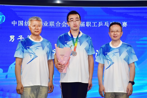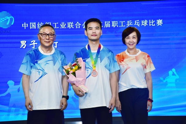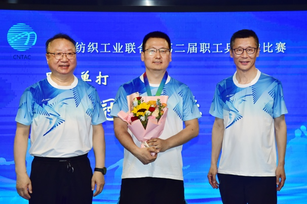 中國紡聯會長孫瑞哲,專家咨詢委員會委員、原紀委書記王久新,副會長徐迎新、陳大鵬、楊兆華、閻巖分別為獲得男子單打冠軍的中國紡織出版社有限公司李然、男子單打亞軍的中國紡織機械協會葉晉浦、男子單打季軍的中國紡織建設規劃院張杰頒獎。