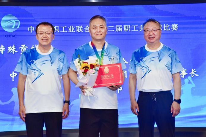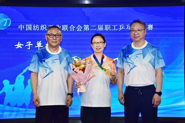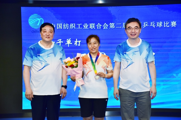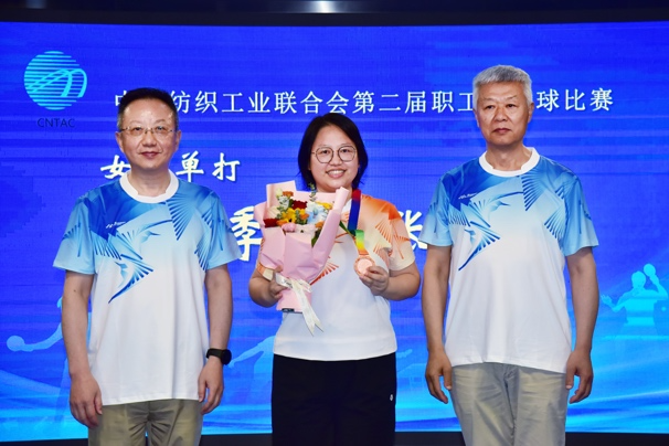 中國紡聯會長孫瑞哲,黨委副書記陳偉康,專家咨詢委員會委員、原紀委書記王久新,副會長徐迎新、端小平、楊兆華分別為獲得女子單打冠軍的中國紡織出版社有限公司江飛、女子單打亞軍的中國紡織工程學會崔秀娟、女子單打季軍的中國紡織工程學會張洪玲頒獎。