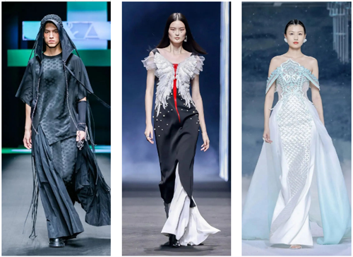 本季時裝周上,中國美學、非遺創新成為多數品牌首選基調。眾多設計獎良渚文化、三星堆文化、五行文化、山海經、古典詩詞、古典戲劇、書法繪畫等進行了藝術化、潮流化融合創新表達。本季涉及的非遺工藝包括京繡、蘇繡、絲綾堆繡、潮繡、打籽繡、苗繡、緙絲、香云紗等數十種非遺工藝,展現出與現代潮流、生活方式接軌的新風貌。