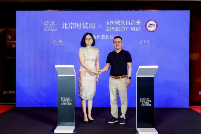 ![]() 北京時裝周有限責(zé)任公司總經(jīng)理 趙哲與玉樹州文體旅游廣電局黨組成員、副局長趙立平共同進(jìn)行玉樹藏族自治州文體旅游廣電局與北京時裝周的戰(zhàn)略簽約儀式
