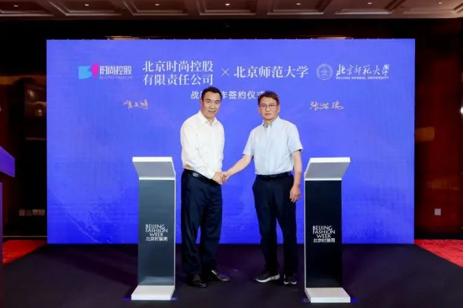 ![]() 北京時裝周組委會執(zhí)行主席、北京時尚控股有限責(zé)任公司黨委常委、副總經(jīng)理贠天祥與北京師范大學(xué)新聞傳播學(xué)院院長張洪忠共同進(jìn)行北京師范大學(xué)與北京時尚控股有限責(zé)任公司的戰(zhàn)略簽約儀式