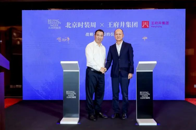 ![]() 北京時裝周組委會執(zhí)行主席、北京時尚控股有限責(zé)任公司黨委常委、副總經(jīng)理 贠天祥與王府井集團(tuán)副總裁、北京區(qū)域負(fù)責(zé)人胡勇共同進(jìn)行王府井集團(tuán)與北京時裝周的戰(zhàn)略簽約儀式