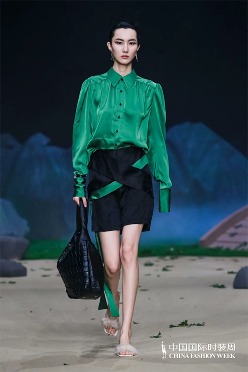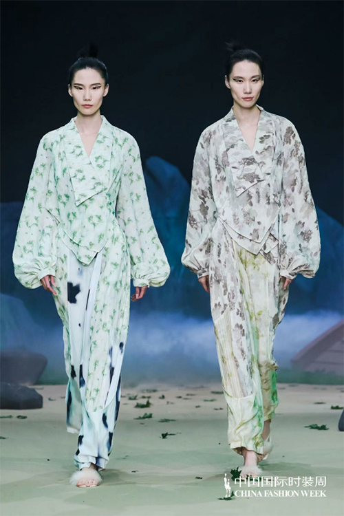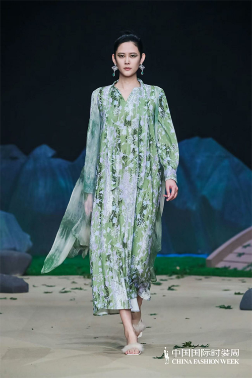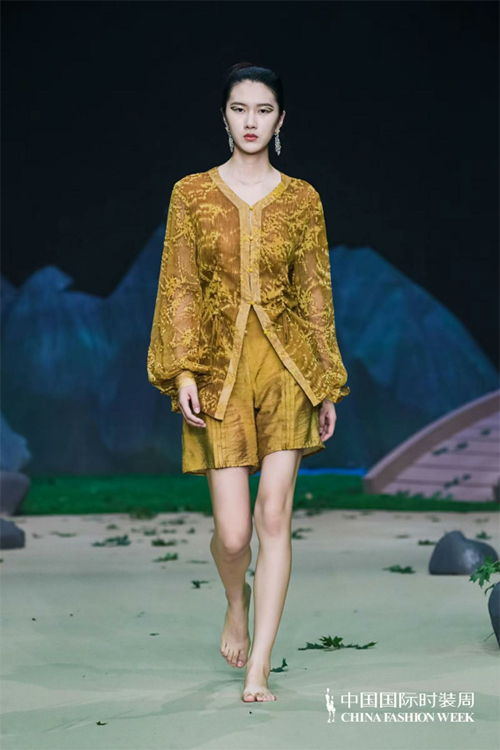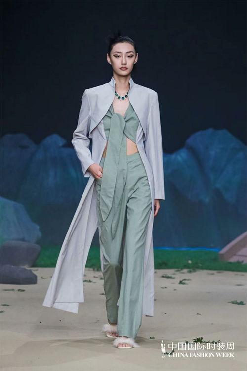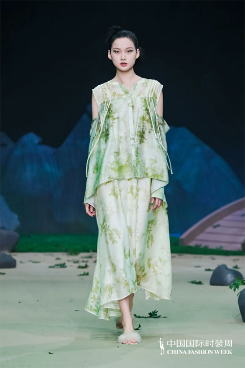 ![]() ![]() 本季依然以生機綠色為主打,寂靜清幽亦或是生機活力,加以招搖山生產的礦石、金礦色彩輔之相互碰撞沖擊。作為華夏民族內心羈絆最深的色彩:大地與金礦的踏實和沉穩、青綠的生機與希望。服裝工藝將祝馀草藥平面線段化通過打條、波浪塔克褶、編織扭結,以及裝飾繩帶等工藝元素來呈現,再用明針強化整體服飾的年輕感。扭結規律的層疊和隨性彎曲的線條引導身材的橫豎走向,編織扭結凸顯有致的立體感;裝飾繩帶極具手工質感,又加強了服飾穿著的流動美感,讓身體“動起來”來的藝術氛圍拉滿;明針走線不止強調了國潮色彩還將自然的年輕感輕松流露,拓寬服飾的年齡層次。同時,明針走線與中式傳統立領、改良門襟,以及盤扣設計相結合,打破服裝的平面化和沉悶感,是中式服裝的保留“曲目”,也是最適合春夏運用的點睛之筆,使其煥發出新的生機,給人以溫婉雅致、飄逸出塵的感覺。