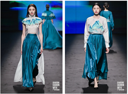 ![]() 開幕當日,領銜開SHOW的高級時裝品牌KAISERIN鎧琪以“綠美中國”為創作主題,遵循“綠水青山就是金山銀山”的核心思想,以“以自然之道,養萬物之生”為設計理念,借鑒宋代王希孟所作的《千里江山圖》中的絢麗色彩和生動景象,用繡花工藝為表現形式,展現了中國綠水青山秀麗壯美的景色,鼓勵每一個人關注環保議題,以此傳遞出一種珍惜自然、保護地球的生活方式。