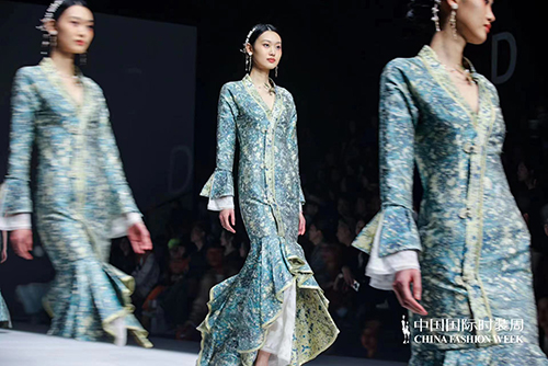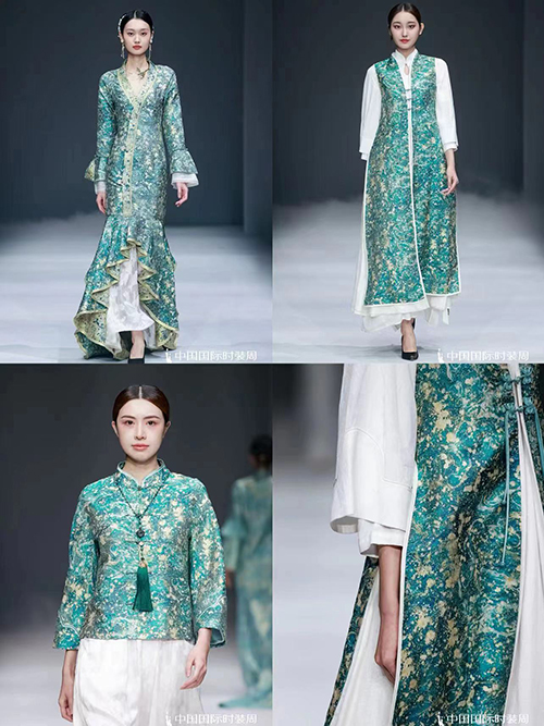 本季發布根據新時代生活方式需求,打造國風禮服與國風成衣不同穿著體驗。面料采用全真絲織錦、真絲綃、醋酸緞、水溶刺繡蕾絲、提花絲麻等面料,結合手工緙絲、刺繡、盤扣、織錦、印金、植物染等各項非遺工藝。結合現代藝術與零碳環保理念,融合中國傳統文化印記與風格進行設計再創,重新定義新國風服飾的潮流風向。