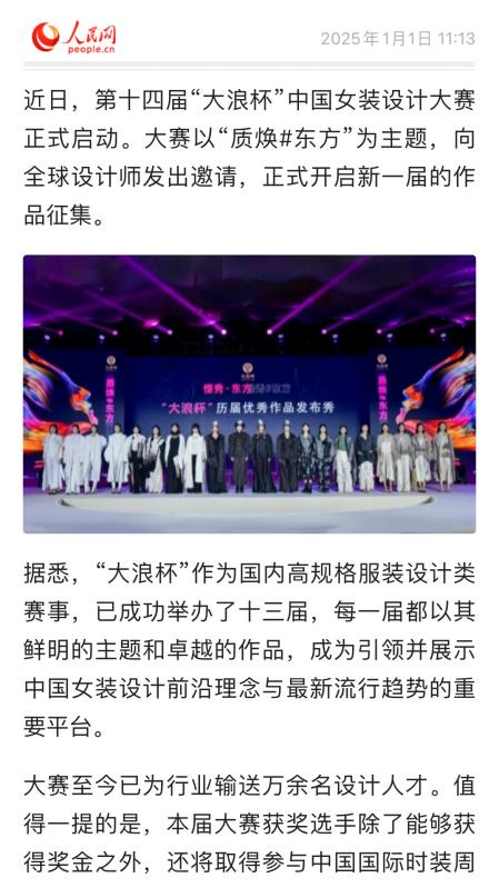 細節見真章,匠心蘊久長。已成功舉辦十四屆的“大浪杯”中國女裝設計大賽,匯聚全球上萬名設計師推動東方藝術文化創新傳播。他們以技法革新對接市場需求,以文化自信詮釋當代審美,讓傳統美學在時裝領域綻放時代華彩。