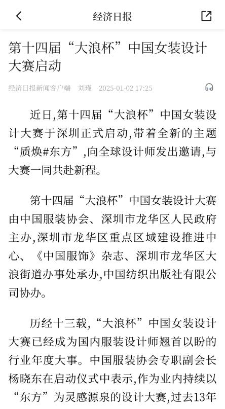 ![]() “本屆大賽主題契合產業新質生產力發展方向,大量作品構思強調了東方時尚元素與科技應用的結合。”中國服裝協會專職副會長楊曉東表示,參賽作品注重挖掘中國傳統元素,并在材質和AI技術應用上有所創新,體現了設計與產業的深度聯動。“大浪杯”連續舉辦十四年,顯著提升了中國年輕設計師水平,促進了行業人才培養,尤其在推動中國服裝產業的創新力和可持續發展方面發揮了積極作用。