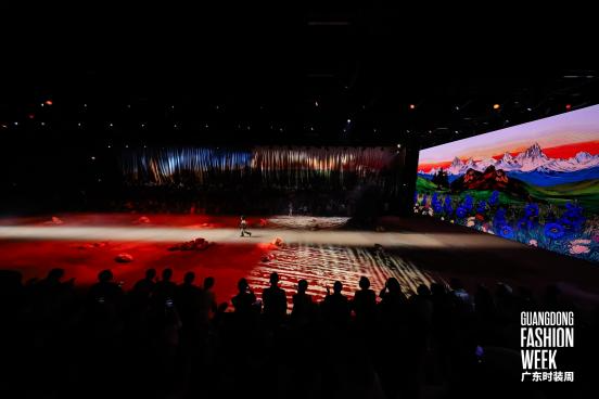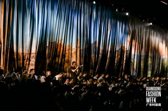 在本次秀場T臺兩側長32米高6米的背景印花布,一條伸展在曠野的公路,遠山低垂著飄逸的白云,還有藍色的綠絨蒿、奔跑的野鹿等,這種層次感、圖案精細度,以及色彩還原程度,逼真震撼,仿佛身臨其境,都是通過冷轉移印花技術制作出來,得益于其特殊的轉移載體的印刷方式,圖案最終以高精度呈現。