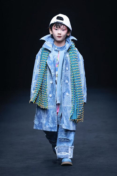 ![]() 開場童模向洛寬身著秀場限定——“傾潮藍?!倍ㄖ萍兪止ぶ槔C牛仔風主題服裝,設計師直接把面料做舊為「油墨感印花貼片」效果,縫制上去做舊、磨白、刀割,像剛從70年代哈雷后座滾下來的搖滾少年,穿越玄境,走上街頭,童年穿搭也能“潮”出天際。