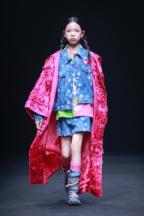 ![]() 壓軸童模周雨彤作為本場的壓軸亮相,身著秀場“甜辣美學”粉藍拼色牛仔風套裝,她在這面玄境中化身反叛公主,糖果色T恤,牛仔藍半裙套裝中和成海鹽蘇打的酷感,長大后的自己解鎖了牛仔時髦密碼,是一代又一代年輕人的”吶喊”。