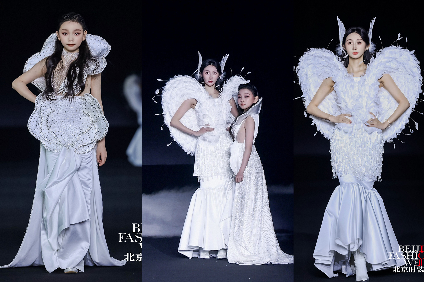 ![]() 白色系列開場兒童主秀模特曲婧雅和開場成人主秀模特高夢涵,身著“初曦”白色禮服驚艷亮相,宛若林間月光下的精靈,純凈優雅、仙氣十足。璀璨鉆飾點綴輕盈面料,如破曉時分的薄霧微光,為整場大秀寫下夢幻而充滿力量的開篇。