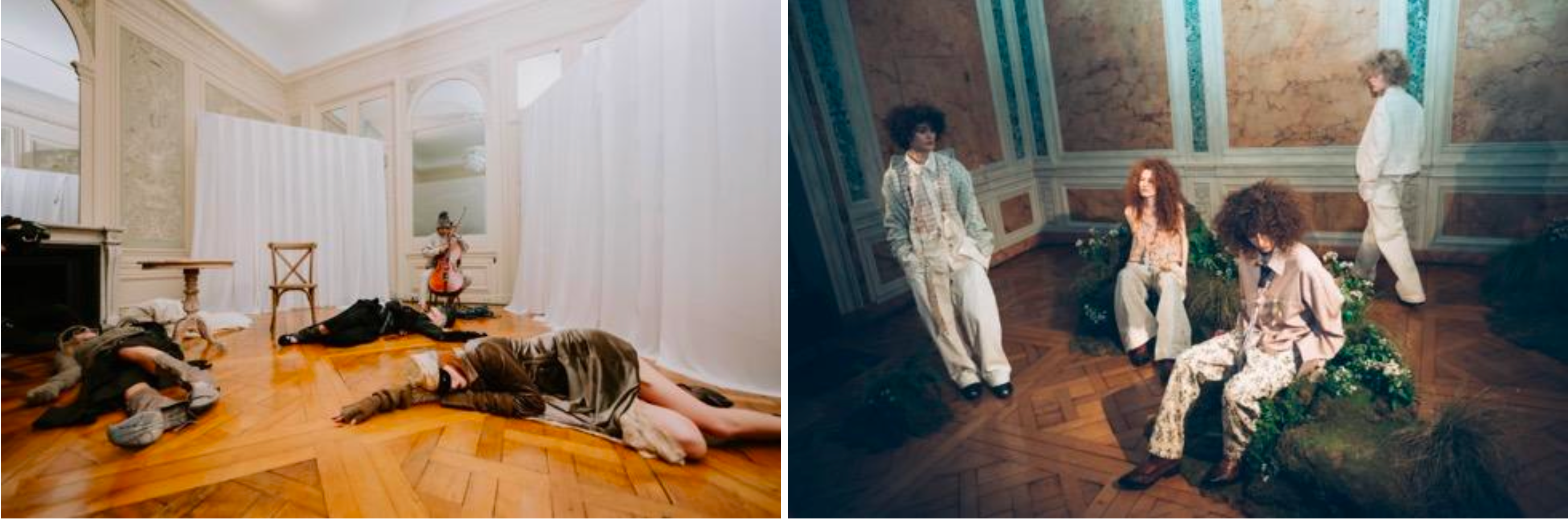 品牌通過蠟處理工藝讓面料呈現(xiàn)出仿佛被時間凝固的質感,使服裝如同被保存的歷史碎片。在演示現(xiàn)場,AENRMOUS更與大提琴音樂家Ouri合作,以電子合成方式重新詮釋古典音樂,打造融合音樂與時裝的沉浸式體驗。