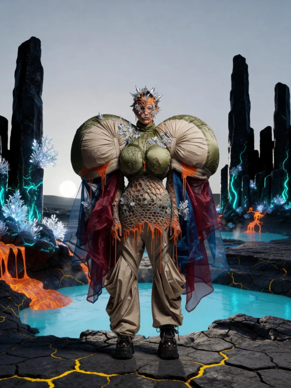 ![]() ![]() 劉野野的《幽壑晶生》以真菌學(xué)與超現(xiàn)實(shí)主義為基底,將人體重塑為寄生演化生態(tài)中的宿主。反解剖廓形、沖突材質(zhì)、有機(jī)色調(diào)、晶體面罩——算法模擬的不是快捷方式,而是“衰變即創(chuàng)生”的生命哲學(xué)。