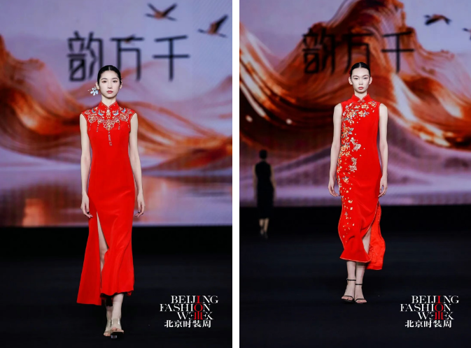 在韻萬千的“花神織夢”旗袍大秀上,作為湘派旗袍第四代傳人,創始人許紅艷將湘繡蘇繡合璧,鬅毛針繡活祥鹿色彩,虛實針暈染喜鵲登梅,將吉祥寓意織入衣袂。更值得關注的是,品牌運用AI遠程量體技術、7項軟件著作權賦能的定制體系,讓非遺從“手工作坊”走向可復制的個性化定制。從一人一版到遠銷27國,韻萬千證明了非遺可以既是“可穿的藝術”,也是“全球的生意”。