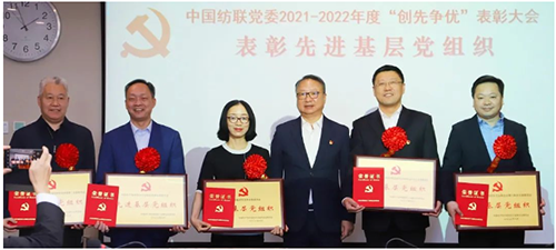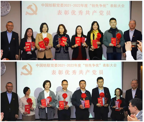 中國紡聯(lián)領導班子成員為 “優(yōu)秀共產黨員”“優(yōu)秀黨務工作者”“先進基層黨組織”頒獎。