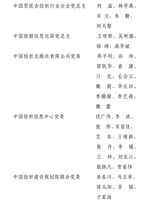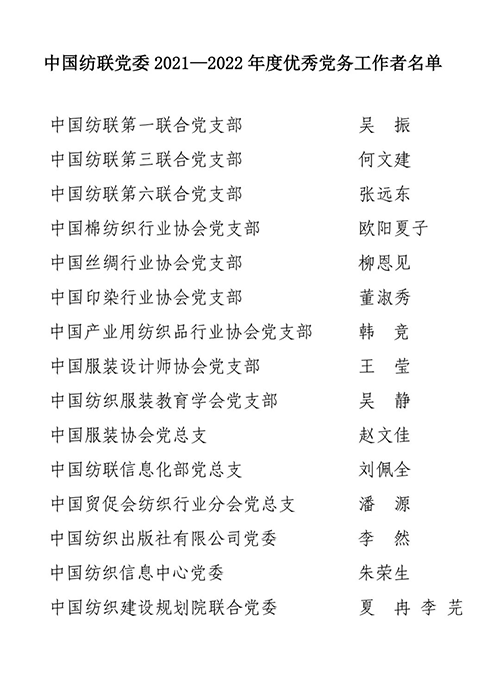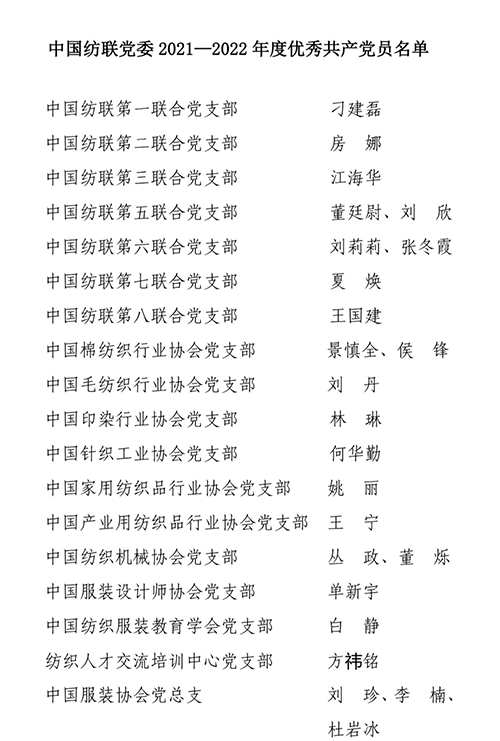 根據《關于評選表彰中國紡聯(lián)2021—2022年度“先進基層黨組織”、“優(yōu)秀共產黨員”和“優(yōu)秀黨務工作者”的通知》精神和要求,嚴格按照有關工作程序推進,在中國紡聯(lián)各基層黨組織認真評比推薦的基礎上,經民主投票評比、中國紡聯(lián)紀委審核、中國紡聯(lián)黨委批準,決定授予中國產業(yè)用紡織品行業(yè)協(xié)會黨支部等10個基層黨組織“2021—2022年度中國紡織工業(yè)聯(lián)合會黨委先進基層黨組織”榮譽稱號,授予刁建磊等61名同志“2021—2022年度中國紡織工業(yè)聯(lián)合會黨委優(yōu)秀共產黨員”榮譽稱號,授予吳振等16名同志“2021—2022年度中國紡織工業(yè)聯(lián)合會黨委優(yōu)秀黨務工作者”榮譽稱號。